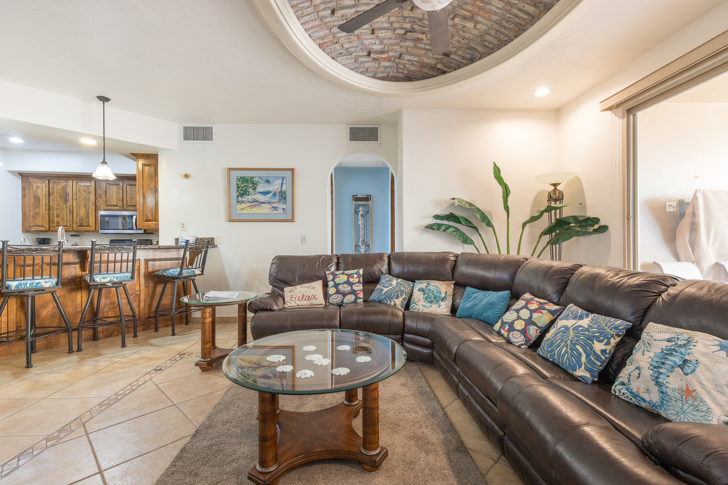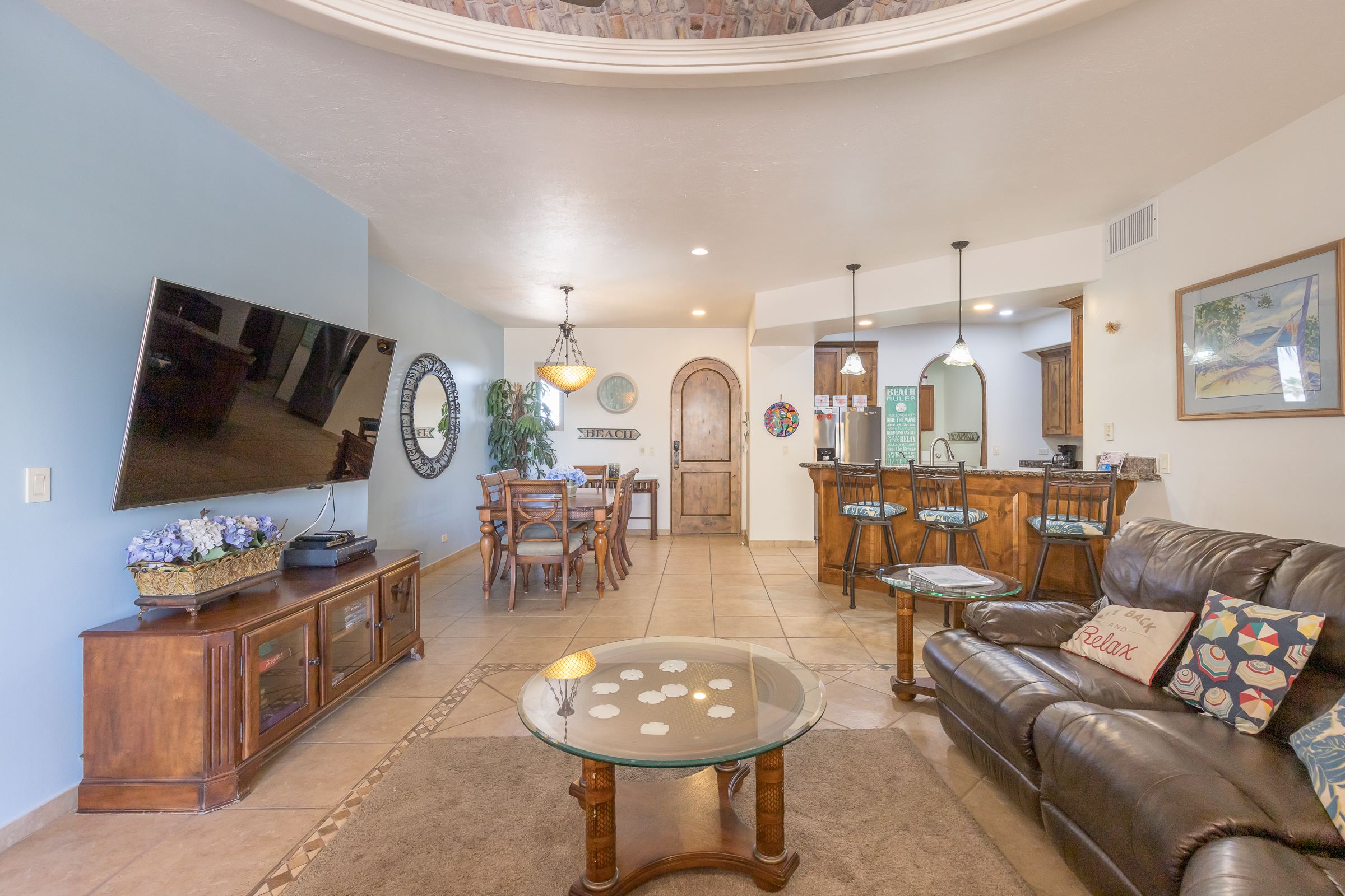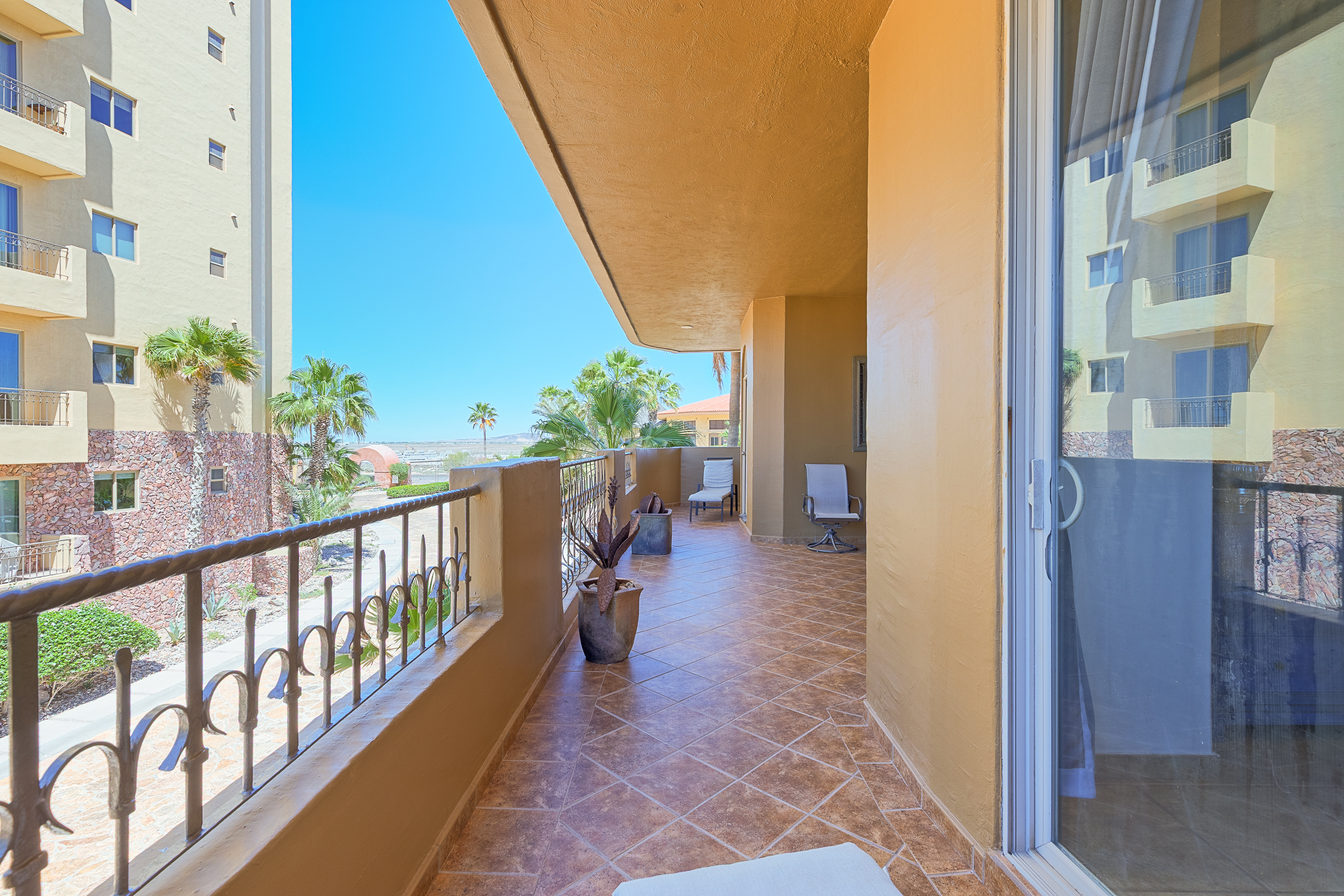 Bella Sirena Resort! 2-Bedroom 2-bathroom condo for sale. Split floor plan with both bedrooms facing the grounds and the Sea of Cortez. Large balcony to enjoy relaxing in the fresh sea air. This beachfront resort has wonderful amenities with 5 pool areas, swim-up pool bar-restaurant, 2 hot tubs, fitness center, tennis/pickleball courts,14 acres of lushly landscaped grounds, 24-hour guard gated and roaming security. This is a great INCOME PRODUCER & is in immaculate condition and is nicely furnished. Tastefully decorated. Kitchen has granite counter tops and under-counter lighting. Alder wood cabinetry & doors throughout. Living room boasts a beautiful boveda brick ceiling, Both Bedrooms have access to the balcony and views! Baths have travertine tile, and the Master has a soaking tub and a stall shower. Agent Remarks-Bank Trust is owned by an AZ LLC for easy transfer of ownership and lower closing costs.